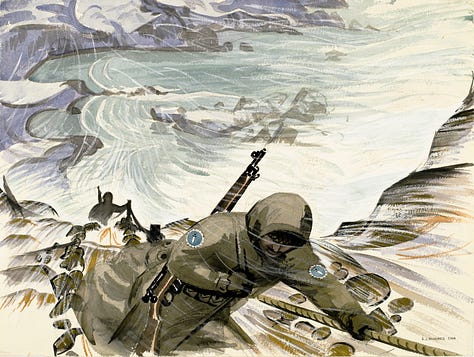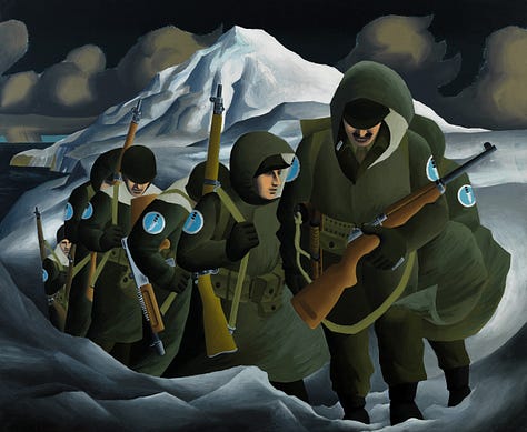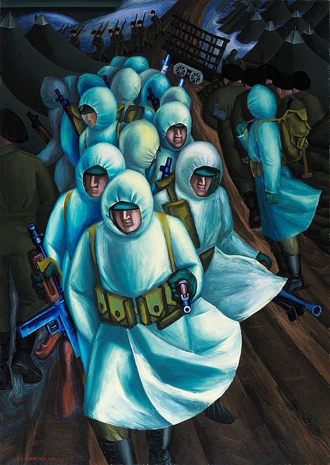 E.J. Hughes (1913-2007) was a Canadian painter, born in my home town, North Vancouver, well known for his landscapes of the coast of British Columbia. He was also commissioned as a war artist during WWII and produced hundreds of drawings and paintings. One of his assignments was Kiska of the Aleutian Islands in Alaska. In 1943, Hughes joined over 5,000 Canadians and nearly 30,000 Americans in Operation Cottage to retake the island from the Japanese occupiers. Unbeknownst to them, however, the Japanese had already evacuated two weeks before they arrived. What ensued, with bad weather, booby traps, trench foot and friendly fire, resulted in nearly 200 casualties, friendly fire accounting for the tragic loss of 4 Canadians and 28 Americans.