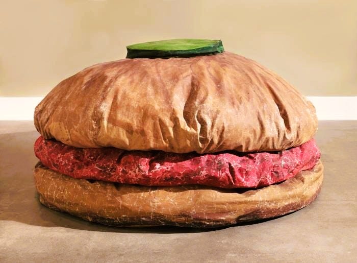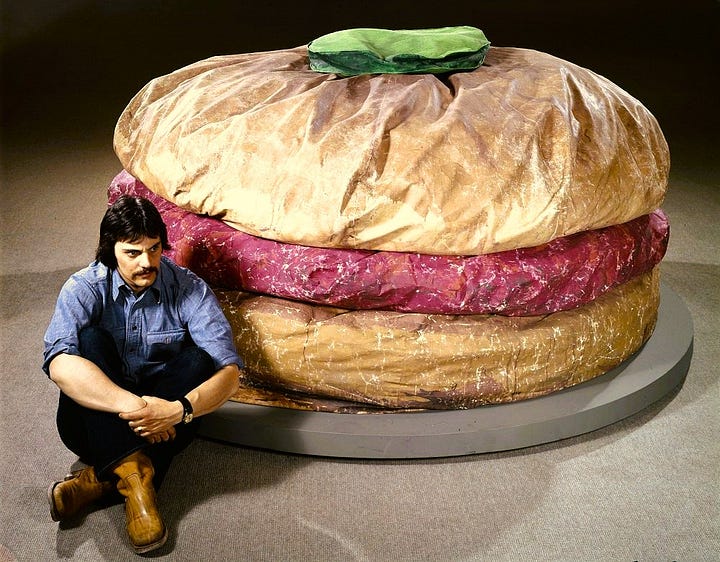 “Pop art is basically about two things: ordinariness and eating.” –Holland Cotter, NYT art critic. Whatever pop art is about, Swedish-born American sculptor, Claes Oldenburg (1929-2022) exemplified it. He is known for his large scale sculptures of ordinary objects, many produced with his third wife, Coosje van Bruggen. Floor Burger (1962) was an earlier piece, weighing in at 700 lbs. Patty Mucha, his first wife, did much of the sewing of the canvas, also stuffing it with styrofoam and newspapers. She tended to work slowly as she would frequently stop to read the news.